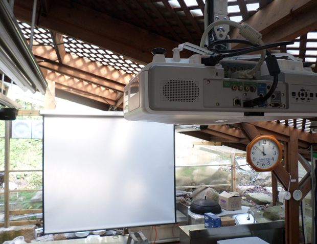 이동식 노래방을 빔프로젝에 연결 , 대형스크린에 화면이 나오며,